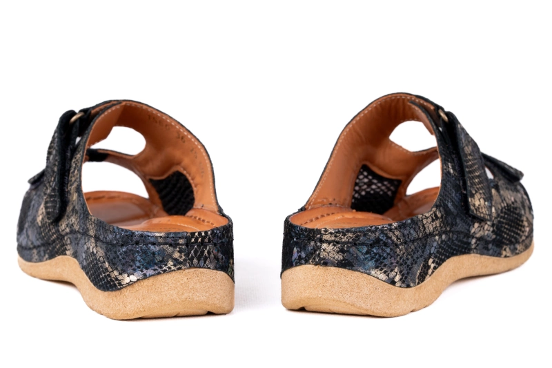Cholewka w czarnym kolorze z subtelnym motywem zwierzęcym wykonana została z miękkiej, naturalnej skóry. Dodaje butom modnego charakteru i elegancji, jednocześnie zapewniając doskonałą wentylację. Po wewnętrznej stronie, w okolicach haluksa, wszyto rozciągliwy stretch, który elastycznie dopasowuje się do deformacji stopy i nie powoduje ucisku.