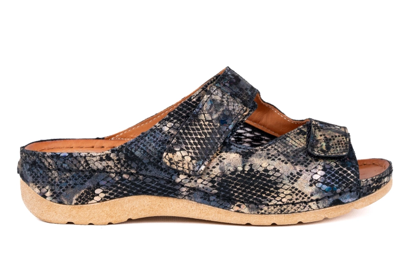 Klapki posiadają regulowane paski na rzepy, dzięki czemu można je łatwo dopasować do stopy – także tej z wysokim podbiciem lub zwiększoną tęgością. To rozwiązanie sprawia, że buty są łatwe do zakładania i idealne na co dzień.