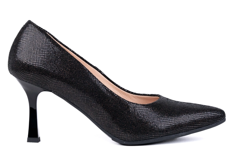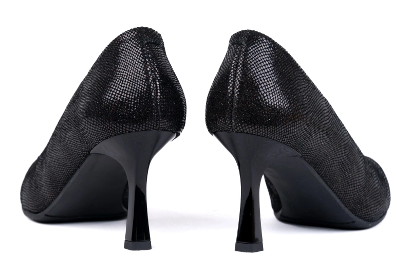 Szpilka o wysokości 7 cm została zaprojektowana w formie obcasa kielichowego – delikatnie rozszerzanego ku podstawie. Dzięki temu czółenka nie tylko prezentują się niezwykle stylowo, ale także oferują większą stabilność niż klasyczna cienka szpilka. Obcas w połączeniu z mieniącym tłoczeniem skóry sprawia, że buty idealnie nadają się zarówno do eleganckich stylizacji biurowych, jak i na wieczorne wyjścia.