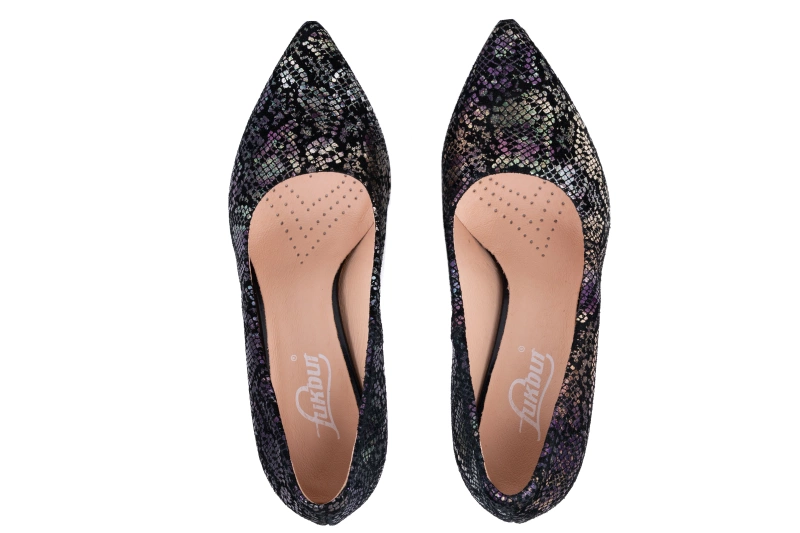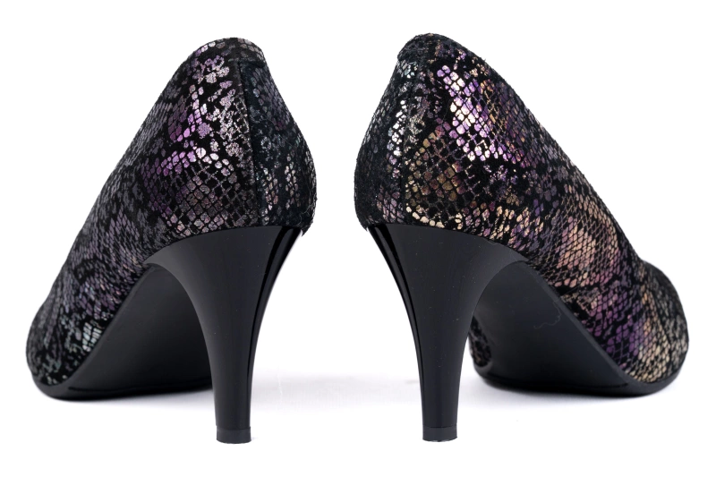 To, co wyróżnia te czółenka, to subtelny efekt multikoloru pojawiający się na czarnej skórze. Mieniące się tłoczenie dodaje butom nowoczesności i sprawia, że stają się wyjątkowym elementem każdej stylizacji. Dzięki temu klasyczne czółenka nabierają niepowtarzalnego charakteru.