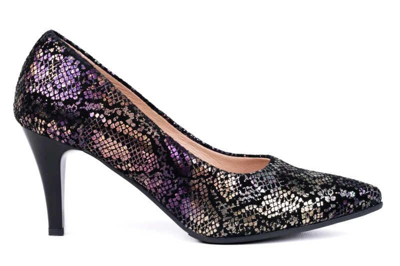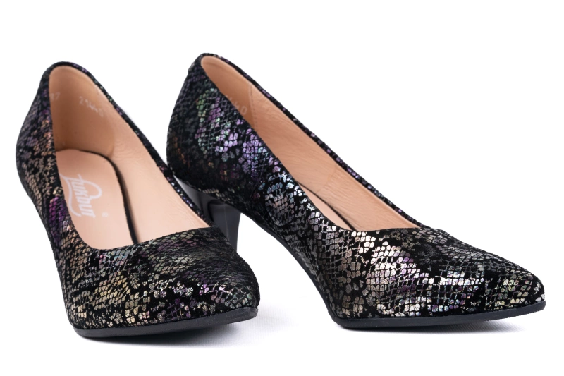 Czółenka damskie to klasyk, który nigdy nie wychodzi z mody. Ten model, wykonany przez producenta obuwia Łukbut z Łukowa, zachwyca połączeniem elegancji i wygody. Uszyte z miękkiej skóry naturalnej, wyróżniają się wyjątkowym wykończeniem – bazowa czerń została urozmaicona tłoczeniem, które mieni się subtelnym multikolorem. To czółenka, które sprawdzą się zarówno w eleganckich stylizacjach do pracy, jak i w wieczorowych zestawach.
