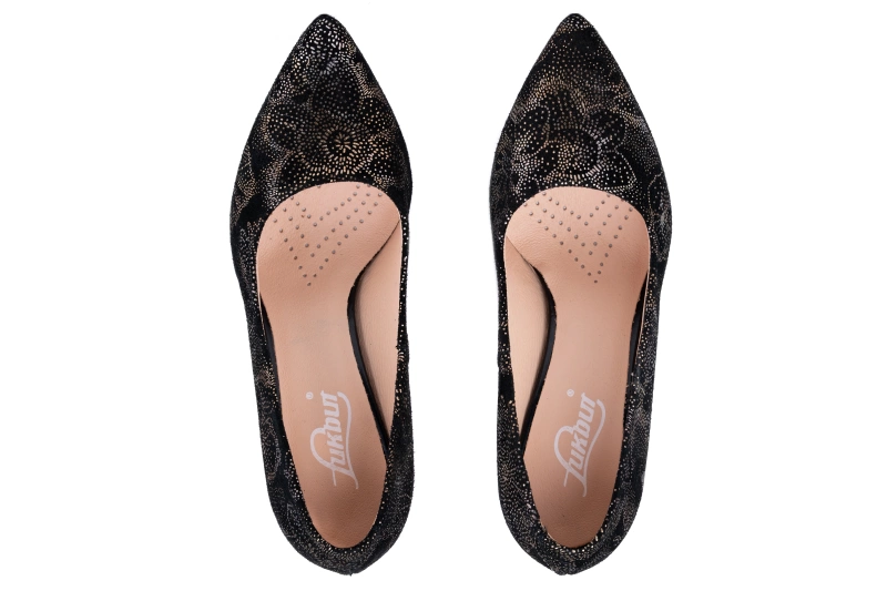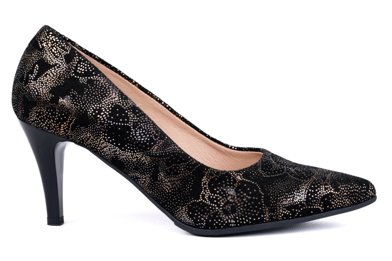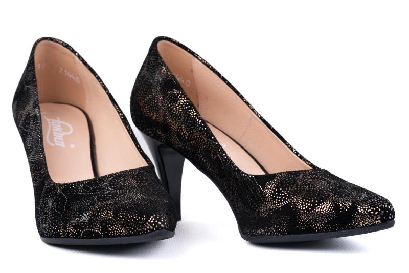 Czółenka damskie to obuwie, które od lat zachwyca swoją ponadczasowością. Ten model od producenta obuwia Łukbut z Łukowa łączy klasykę czerni z subtelnym akcentem – delikatnym złotym tłoczeniem w motyw kwiatowy. Dzięki temu buty wyróżniają się eleganckim wyglądem i niepowtarzalnym charakterem. To propozycja dla kobiet, które cenią sobie wygodę, komfort i modny design w najlepszej jakości.