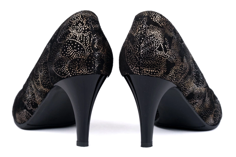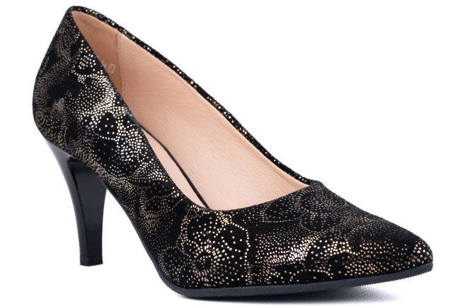 Największym atutem tego modelu jest zdobienie skóry – delikatny, złoty motyw kwiatowy nadaje butom wyjątkowego uroku. Elegancka czerń została przełamana subtelnym detalem, który sprawia, że czółenka stają się nie tylko klasycznym, ale także nowoczesnym dodatkiem do stylizacji.