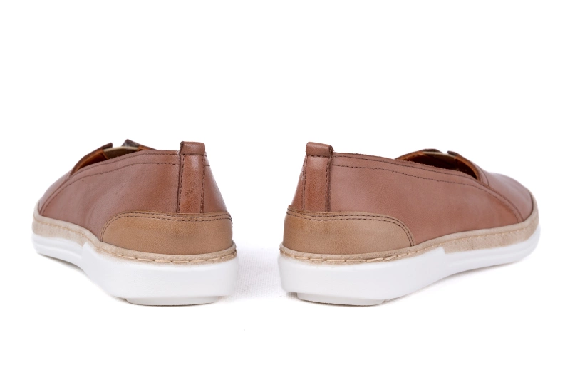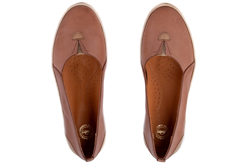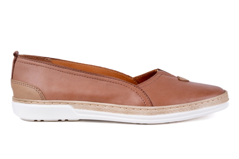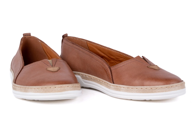 Wierzch baleriny damskiej to miękka naturalna skóra przyjazna dla stopy . W środku baleriny wyłożone są wkładką ze skóry naturalnej  . Buty mają lekką, płaską  podeszwę  która jest ozdobiona wstawką imitującą plecionkę ze słomy .