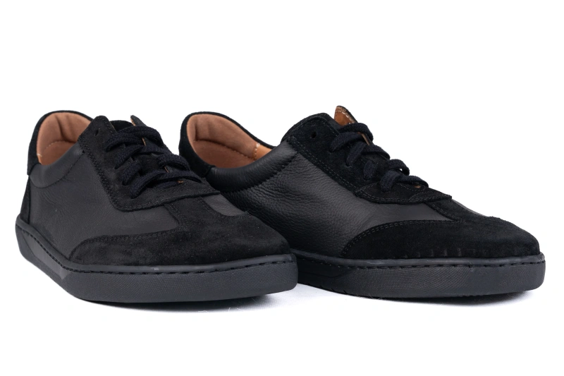 Konstrukcja barefoot została oparta na naturalnym, anatomicznym kształcie stopy, dlatego przednia część buta jest szeroka i zapewnia palcom przestrzeń do swobodnego ułożenia. Brak zwężeń i ucisku sprawia, że stopa pracuje w sposób naturalny, co poprawia komfort, stabilność oraz równowagę ciała. Połączenie czarnej skóry groszkowanej z aksamitnym welurem na nosku i pięcie nadaje obuwiu głębi i elegancji, a złote detale subtelnie podkreślają luksusowy charakter modelu. Producent z Łukowa tworzy obuwie, w którym wygoda i estetyka spotykają się w doskonałej harmonii.