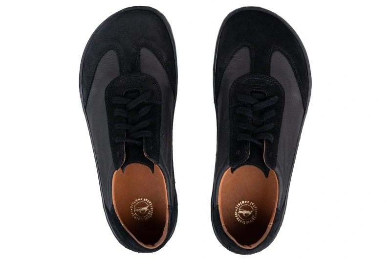 Damskie buty barefoot z czarnej skóry groszkowanej i weluru – elegancja, wygoda i naturalny ruch