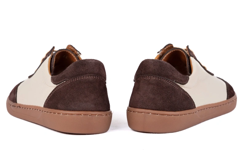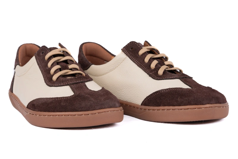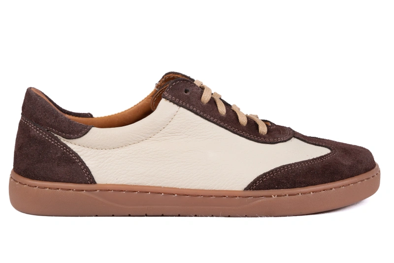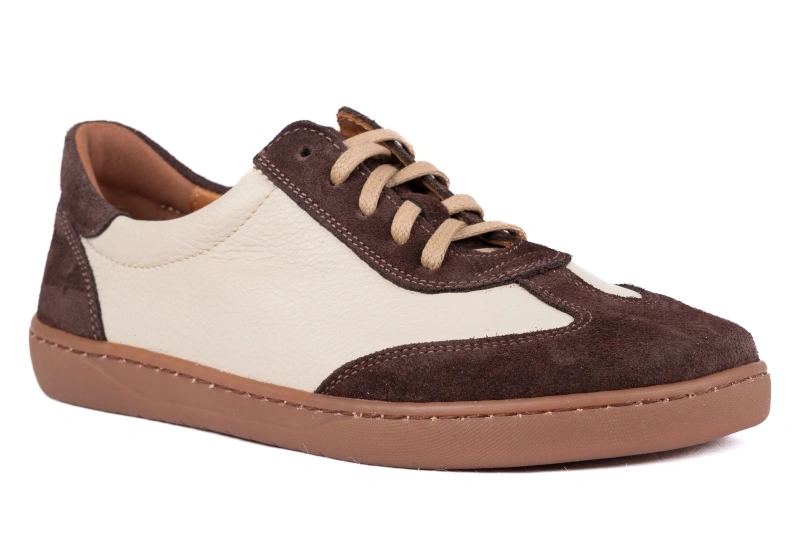 Buty barefoot zaprojektowano w oparciu o anatomiczny kształt stopy, dlatego szeroki przód daje palcom przestrzeń do naturalnego ułożenia. Brak ucisku i zwężeń pozwala stopie pracować tak, jak została do tego stworzona, co przekłada się na wyraźnie lepszy komfort, równowagę i stabilność. Połączenie beżowej skóry groszkowanej z brązowym welurem tworzy elegancki, ciepły wygląd, który pasuje do wielu stylizacji, od codziennych po bardziej wyrafinowane. Producent z Łukowa dba, aby wygoda i estetyka szły w tym modelu w parze.