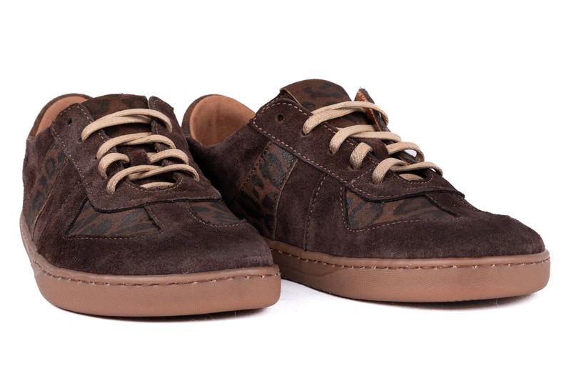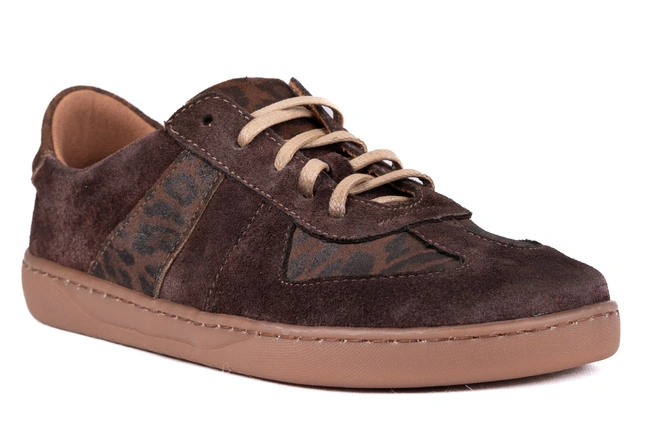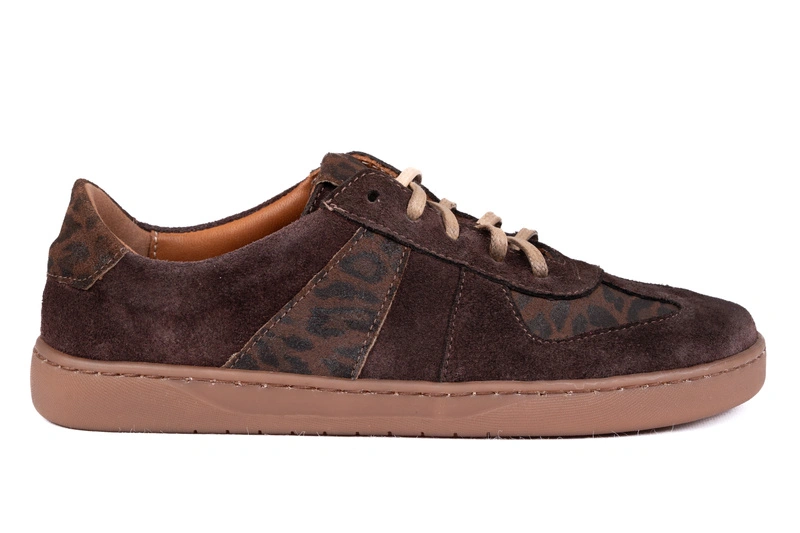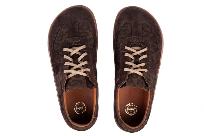 Damskie buty barefoot wykonane z najwyższej jakości skór welurowych w eleganckiej, głębokiej kolorystyce ciemnego brązu, uzupełnione stylową panterkową wstawką w odcieniach brązu, to propozycja dla kobiet, które cenią wygodę, naturalność i ponadczasowy wygląd. Obuwie barefoot powstaje zgodnie z zasadą pełnego odwzorowania naturalnego kształtu stopy, dzięki czemu zapewnia wygodę, której nie dają klasyczne fasony. Ten model to buty polskie tworzone przez polskiego producenta obuwia z Łukowa, wykorzystującego najwyższej jakości skóry i własną linię produkcyjną. Każda para to efekt starannego połączenia komfortu, lekkości i solidnego wykonania. W naszym sklepie internetowym oraz sklepie online lukbut.com znajdziesz obuwie, które dba o zdrowy ruch i wygodę na co dzień.