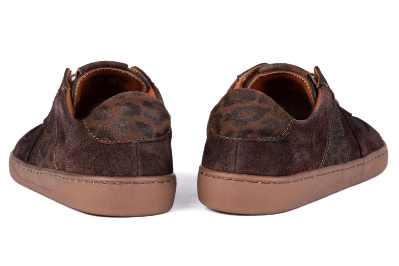 Wnętrze obuwia wyściełane jest miękką i przyjemną wkładką, która zapewnia komfort nawet podczas wielu godzin noszenia. Użyte skóry welurowe wyróżniają się doskonałą miękkością, trwałością oraz eleganckim wyglądem. Połączenie ciemnego brązu z brązową panterkową wstawką tworzy stylowy, wyważony design odpowiedni zarówno do codziennych stylizacji, jak i bardziej eleganckich zestawów. Każda para powstaje w Polsce dzięki naszej własnej linii produkcyjnej, co gwarantuje precyzję wykonania i dbałość o każdy szczegół.