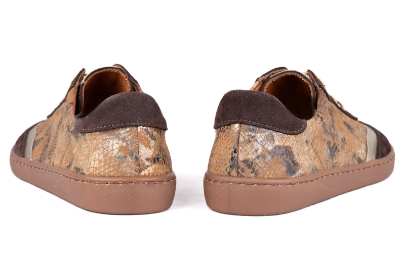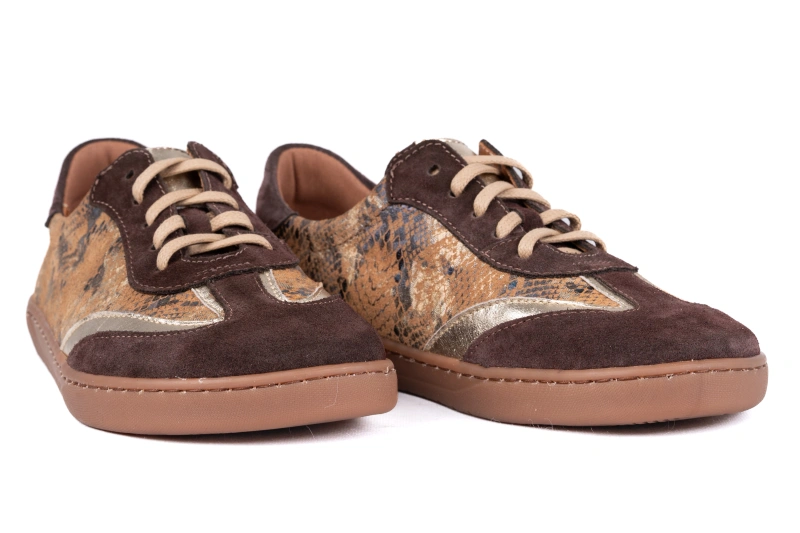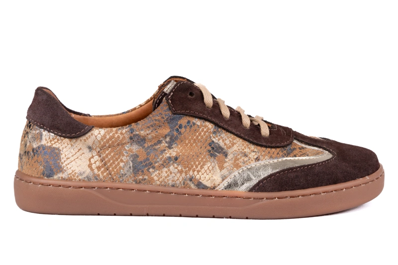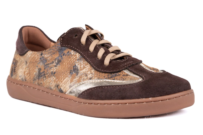 Te wyjątkowe damskie buty barefoot łączą miękką skórę welurową w ciepłym odcieniu brązu z bocznymi panelami ze skóry z motywem węża w odcieniach brązu i beżu, tworząc efektowny, modny design. Model powstaje w polskiej produkcji, w naszej własnej linii produkcyjnej, dzięki czemu każda para charakteryzuje się najwyższą jakością, trwałością i komfortem. Jako polski producent obuwia Łukbut z Łukowa dbamy o to, aby stopa mogła pracować naturalnie, a każdy detal podkreślał elegancki charakter buta. Dostępne w rozmiarach od 36 do 43, te buty polskie można wygodnie zamówić w sklepie internetowym i sklepie online lukbut.com.