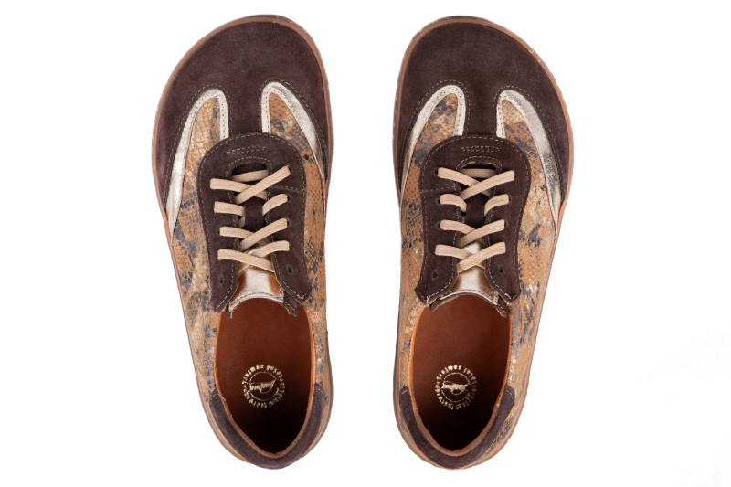 Damskie buty barefoot z weluru w brązie z motywem węża – elegancja, komfort i zdrowy krok