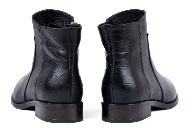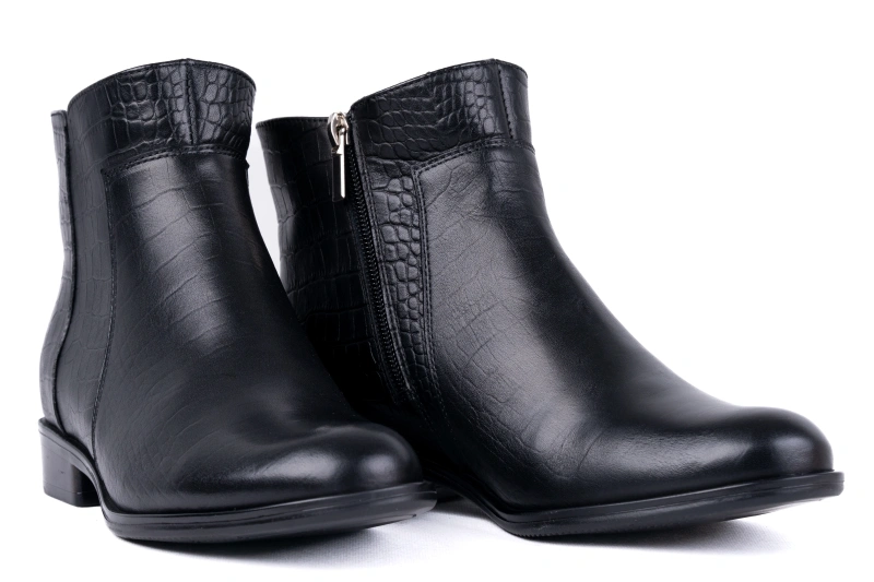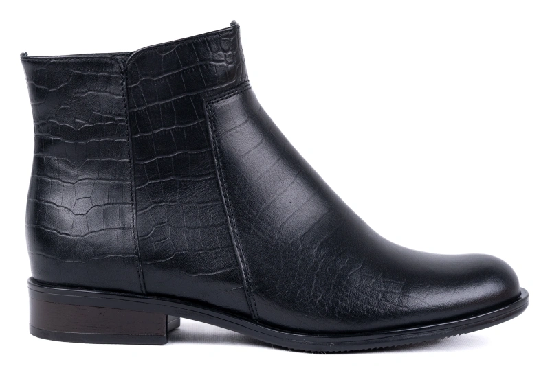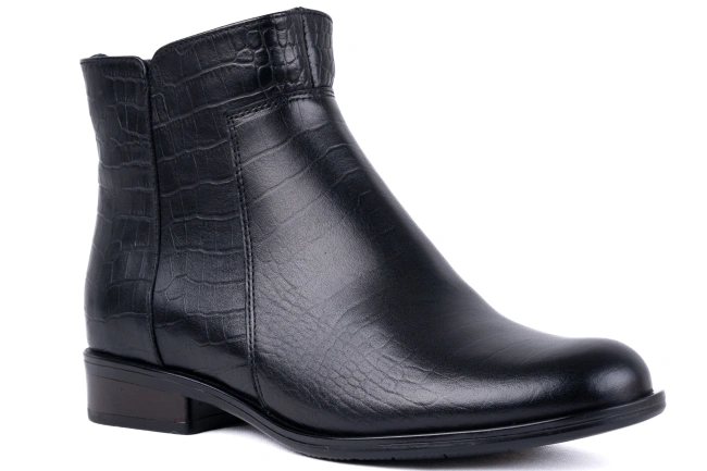Botki sięgające za kostkę to klasyka, która nigdy nie wychodzi z mody. Czarna skóra licowa z tłoczeniem w krokodyli wzór nadaje im eleganckiego, a jednocześnie nowoczesnego charakteru. To model, który świetnie komponuje się zarówno z codziennymi stylizacjami do pracy, jak i z bardziej eleganckimi zestawami na spotkania czy wyjścia. Stabilna, lekka podeszwa zapewnia pewność kroku i wysoki komfort użytkowania, co czyni te botki doskonałym wyborem na co dzień. Prosty, ponadczasowy fason sprawia, że obuwie pasuje do spodni, sukienek i spódnic, podkreślając kobiecy styl.