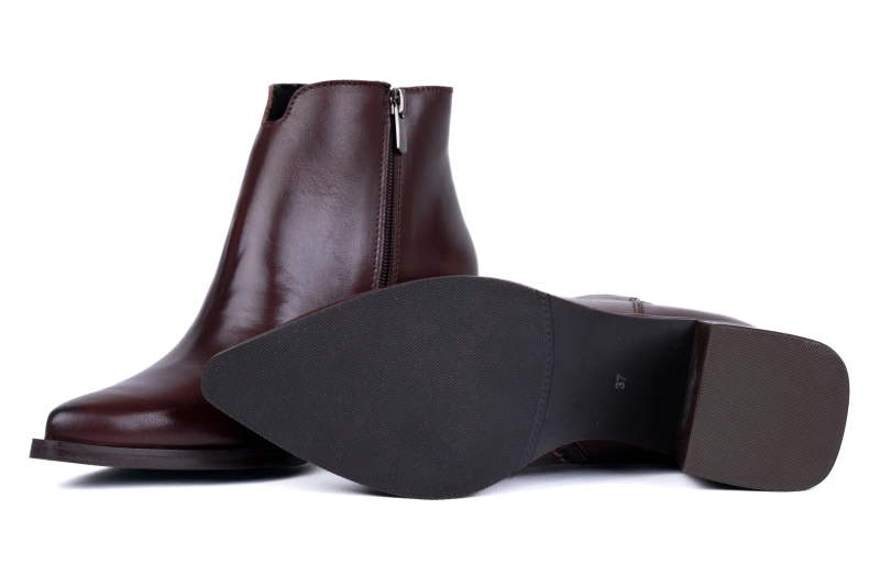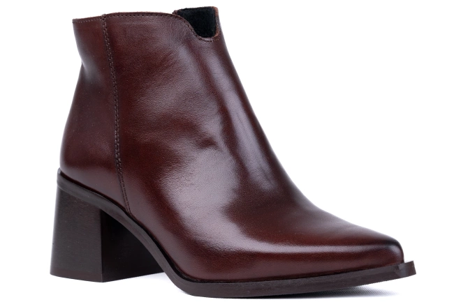 Botki damskie ze skóry naturalnej w głębokim, czekoladowym odcieniu brązu to idealne połączenie klasy i wygody. Wykonane z miękkiej, starannie wyselekcjonowanej skóry, zachwycają subtelnym połyskiem i elegancką linią. Ich lekko wydłużany nosek optycznie wysmukla stopę, a perfekcyjny krój sprawia, że buty prezentują się niezwykle stylowo.