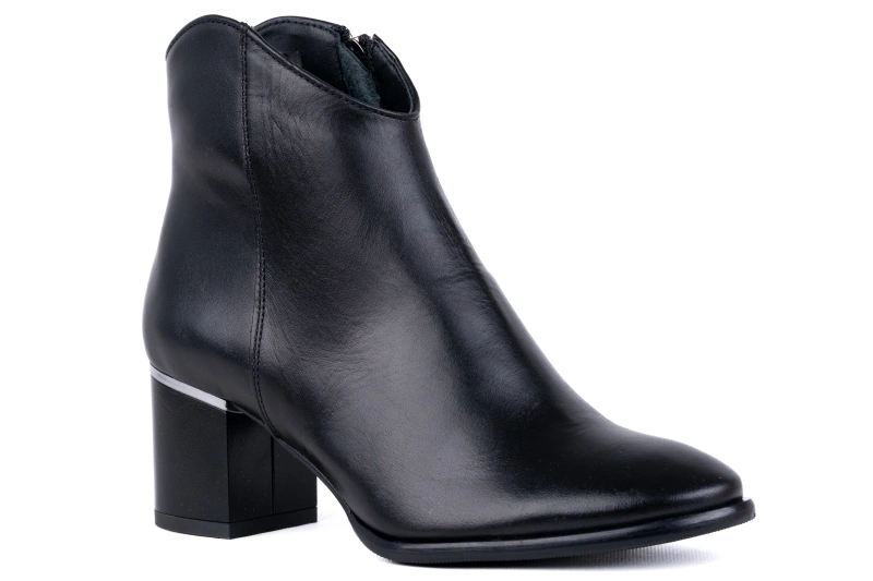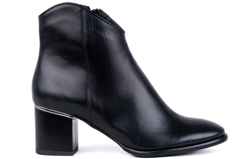 Obuwie uszyte zostało z wysokiej jakości skóry naturalnej, która charakteryzuje się miękkością i trwałością. To materiał, który świetnie dopasowuje się do kształtu stopy, zapewniając komfort nawet podczas wielu godzin chodzenia. Stabilny obcas gwarantuje pewność kroku, a dzięki swojej szerokości jest bardzo wygodny, także podczas dłuższego użytkowania. Srebrna ozdobna wstawka umieszczona na wysokości łączenia obcasa z cholewką nadaje botkom subtelnej elegancji i sprawia, że wyróżniają się na tle klasycznych modeli.