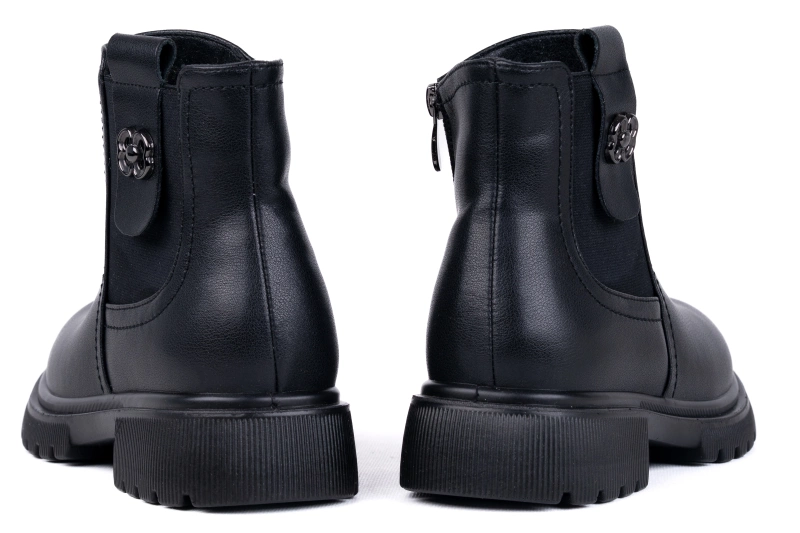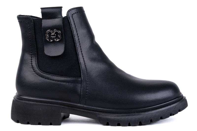 Model wyposażono w wygodny suwak, który ułatwia zakładanie i zdejmowanie butów. Po zewnętrznej stronie botka wszyto elastyczny klin z gumy, ozdobiony skórzaną naszywką. To właśnie na niej umieszczono subtelną ozdobę w kształcie kwiatka, utrzymaną w metalicznym odcieniu czerni. Ten elegancki akcent dodaje botkom unikatowego charakteru i sprawia, że świetnie komponują się zarówno z klasycznymi, jak i bardziej nowoczesnymi stylizacjami.