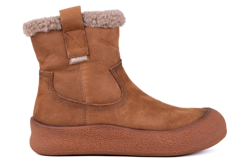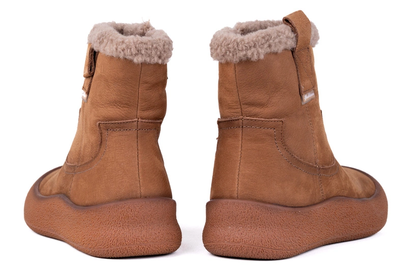 Wierzch buta wykonany został z wysokiej jakości skóry naturalnej welurowej, przyjemnej w dotyku i odpornej na zagniecenia. To materiał, który oddycha, dzięki czemu stopy zachowują świeżość i komfort nawet podczas długiego noszenia. Wnętrze botków zostało wyłożone ciepłym futerkiem syntetycznym, które doskonale izoluje od chłodu, czyniąc buty idealnymi na zimowy sezon. Wysokość cholewki wynosi 18,5 cm, co skutecznie chroni przed zimnem, a jednocześnie optycznie wysmukla nogę.