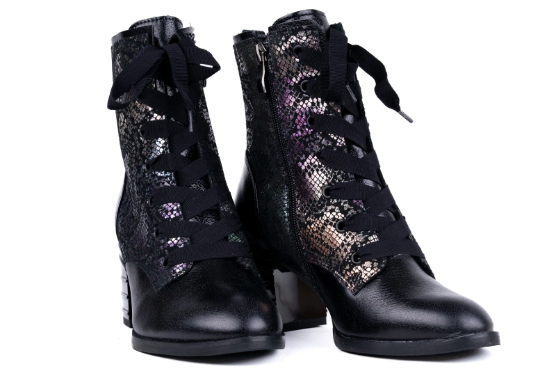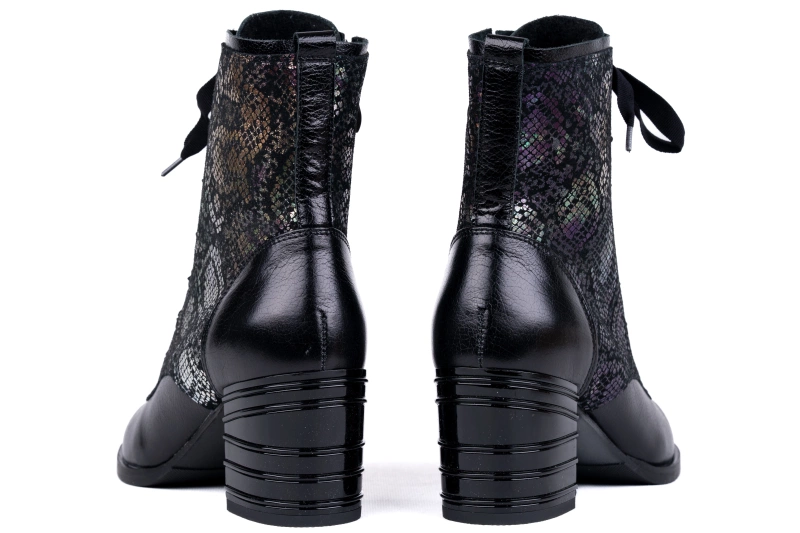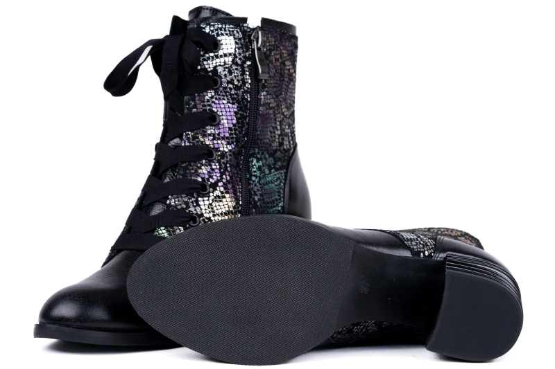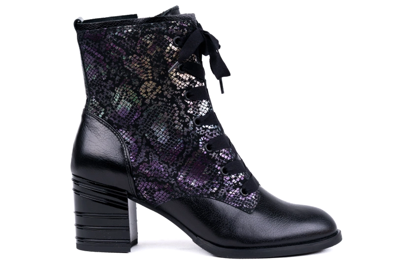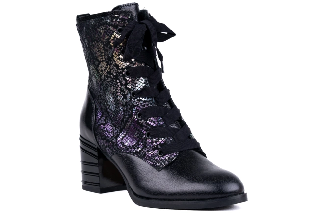 Botki damskie na jesień i zimę to propozycja dla kobiet ceniących wygodę, komfort oraz dobrą jakość wykonania. Model uszyty został z naturalnej, miękkiej skóry w kolorze czarnym, która idealnie dopasowuje się do stopy i pozwala jej oddychać. Boki botków wykonano ze skóry mieniącej się w efektowny multikolor, co dodaje butom nowoczesnego charakteru i szykownego wyglądu. Wnętrze wyłożone jest przyjemnym w dotyku materiałem polarowym, dzięki czemu stopy pozostają ciepłe nawet w chłodne dni.
