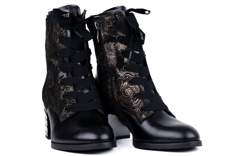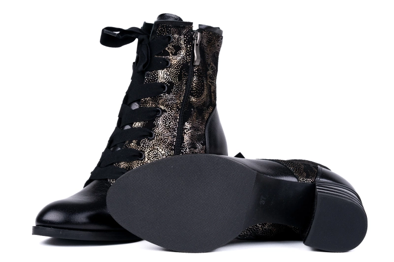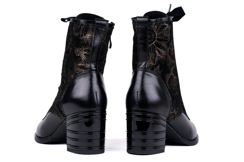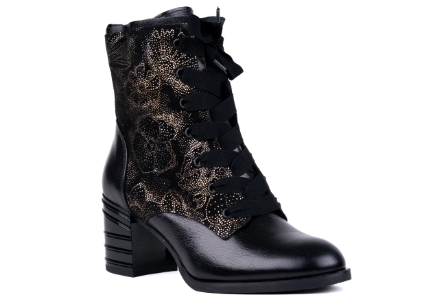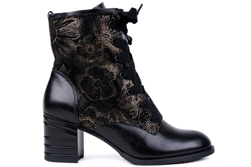 Botki damskie na jesień i zimę to propozycja dla kobiet ceniących wygodę, komfort oraz dobrą jakość wykonania. Model uszyty został z naturalnej, miękkiej skóry licowej w kolorze czarnym, która idealnie dopasowuje się do stopy i pozwala jej oddychać. Boki botków wykonano ze skóry czarnej tłoczonej w złote kwiaty, co dodaje butom wyjątkowego charakteru i subtelnej elegancji. Wnętrze wyłożone jest przyjemnym w dotyku materiałem polarowym, dzięki czemu stopy pozostają ciepłe nawet w chłodne dni.