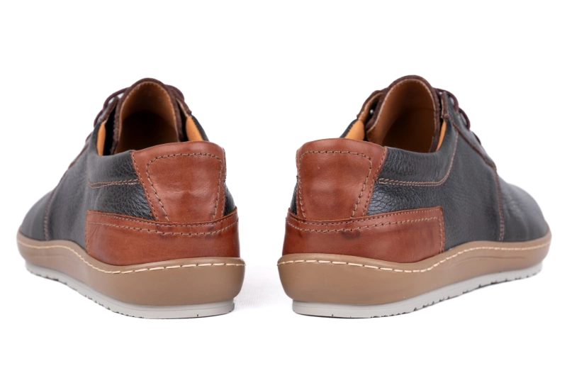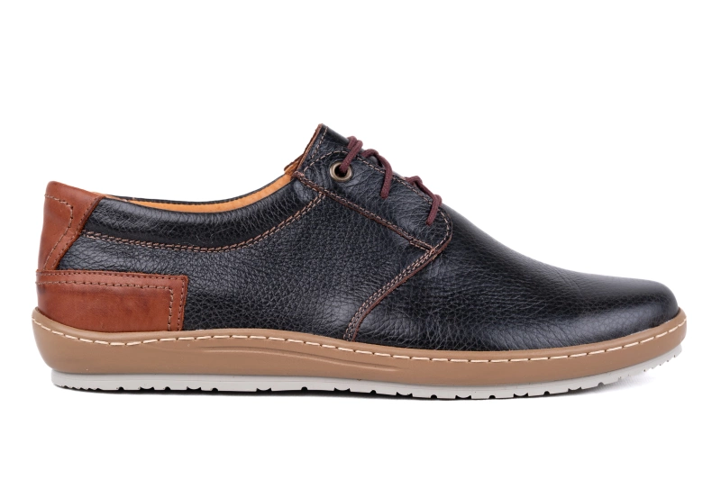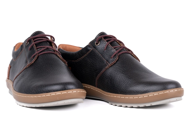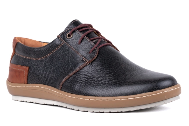 Lekkie i bardzo wygodne półbuty męskie w kolorze brązowym w stylu sportowym. Wykonane z naturalnej skóry,  która charakteryzuje się odpornością na uszkodzenia przy odpowiednim zabezpieczeniu obuwia (impregnacji). Jest to skóra oddychająca, stanowi świetny materiał w przypadku obuwia jesiennego.