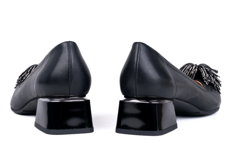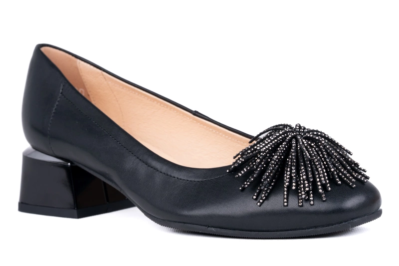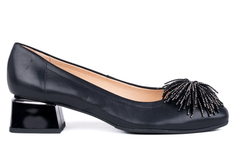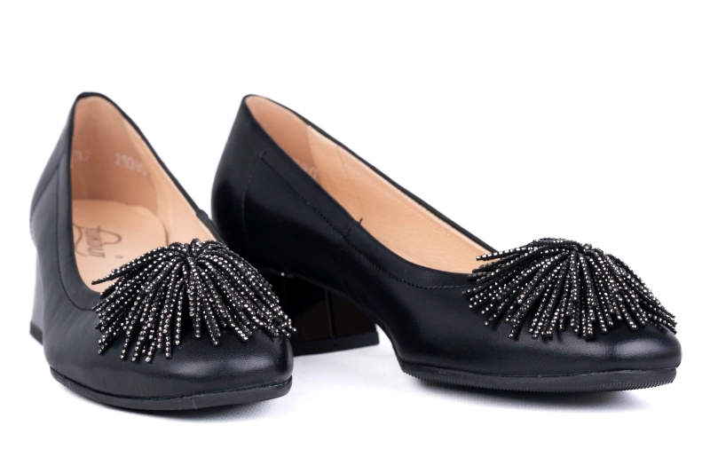 Wyjątkowego uroku dodaje tym czółenkom ozdoba na kształt pomponika z błyszczącymi elementami, umieszczona na wysokości łączenia cholewki z obcasem. Subtelnie połyskujące detale sprawiają, że buty prezentują się ślicznie i delikatnie, podkreślając kobiecy charakter całego modelu. Dzięki swojej prostocie i elegancji czółenka te stanowią idealne uzupełnienie zarówno klasycznych, jak i nowoczesnych stylizacji – świetnie wyglądają do sukienki, spódnicy czy eleganckich spodni.