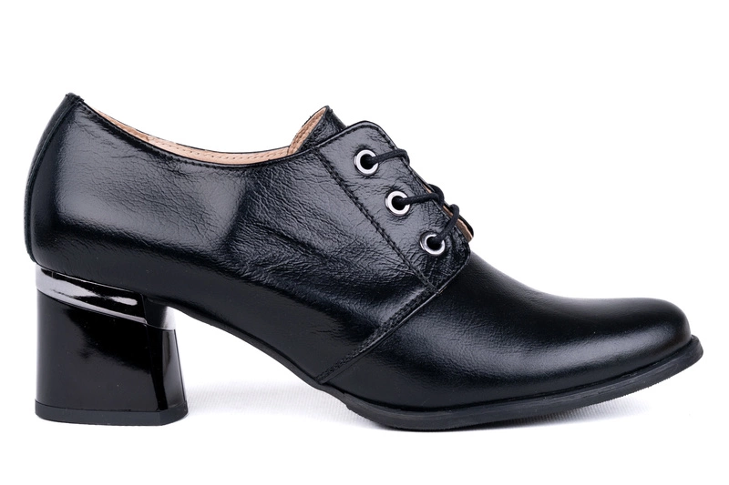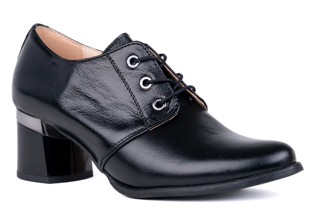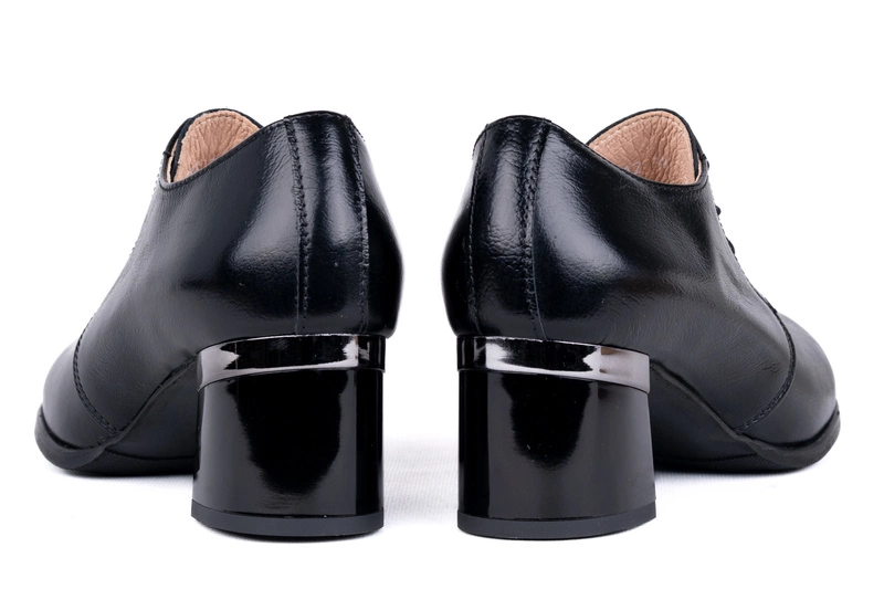 Czółenka damskie z lakierowanej skóry ze zdobionym obcasem