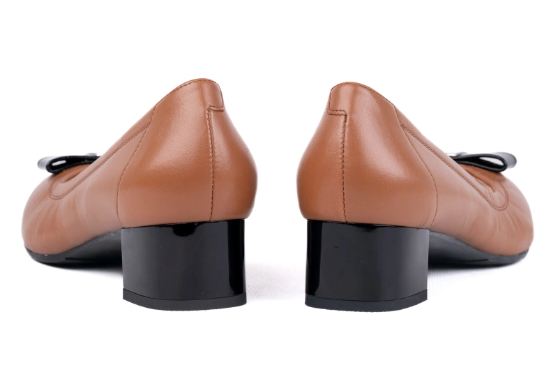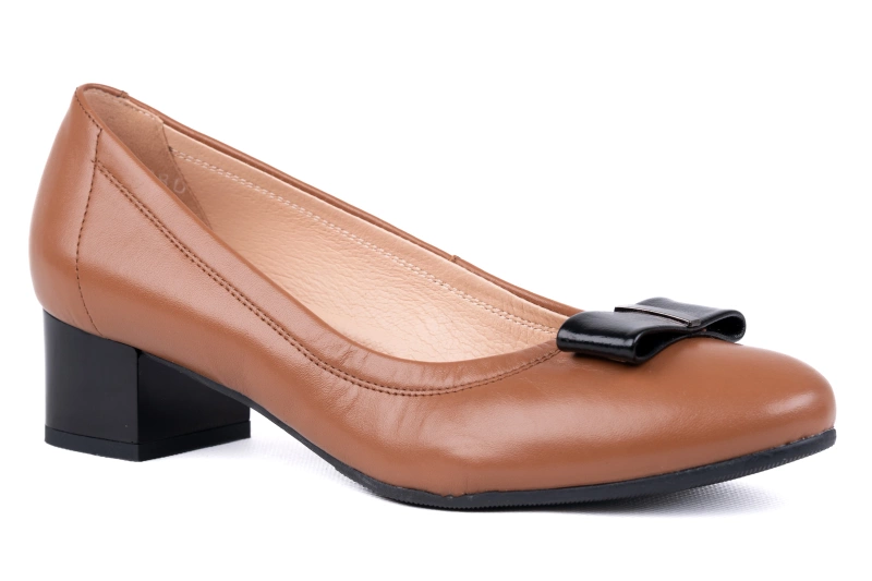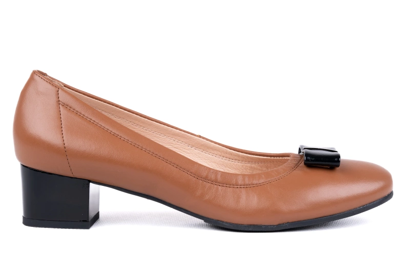 Czółenka damskie na małym klocku o wysokości 4 cm to propozycja dla kobiet, które cenią wygodę i klasyczny styl. Cholewka wykonana została z naturalnej skóry w eleganckim, brązowym kolorze, co sprawia, że buty prezentują się niezwykle szykownie i są ponadczasowe. Wnętrze obuwia również zostało wykończone skórą naturalną, dzięki czemu stopa oddycha, a noszenie czółenek jest przyjemne i zdrowe nawet przez wiele godzin. Stabilny obcas typu klocek w czarnym kolorze zapewnia komfort podczas chodzenia, a dodatkowym akcentem jest delikatna kokardka na cholewce, także w czarnym odcieniu, która podkreśla subtelną elegancję tego modelu.