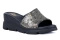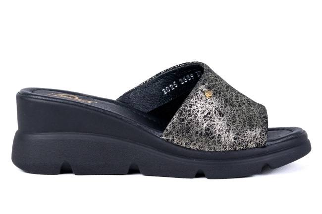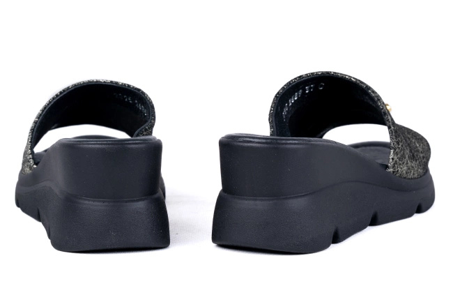 Skórzane klapki damskie na koturnie – czarne ze srebrnym tłoczeniem