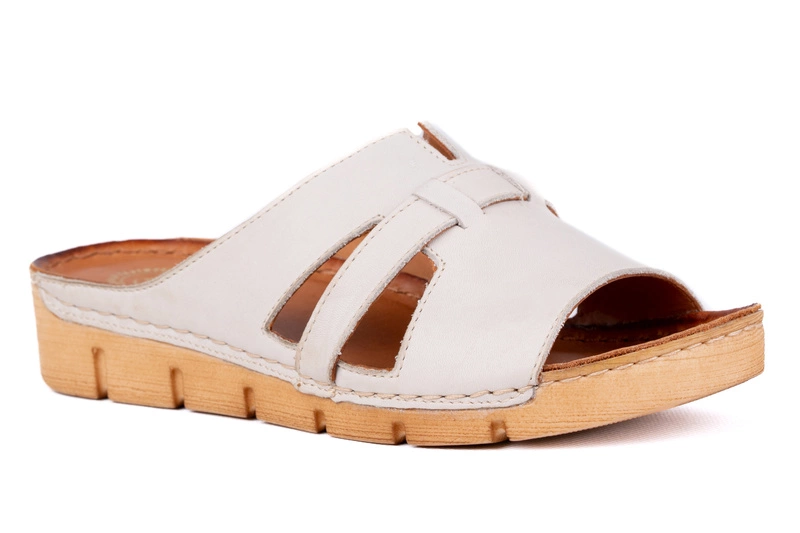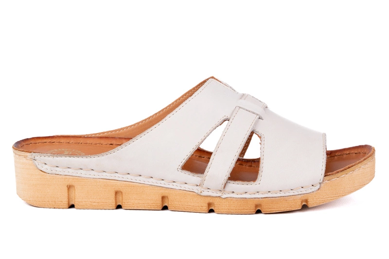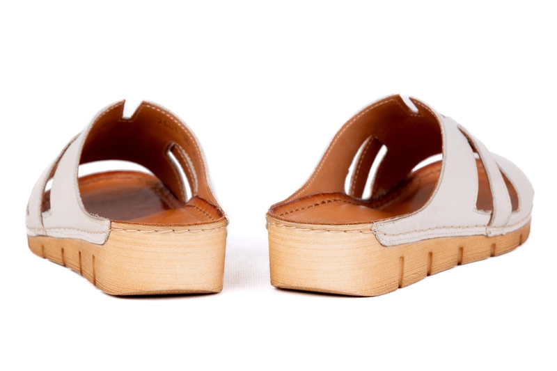 Klapki cechują się wyjątkową lekkością oraz miękką, skórzaną wkładką wewnętrzną, która dodatkowo zwiększa komfort użytkowania. Stabilna, grubsza podeszwa na niewysokim koturnie skutecznie amortyzuje i nie obciąża stóp.