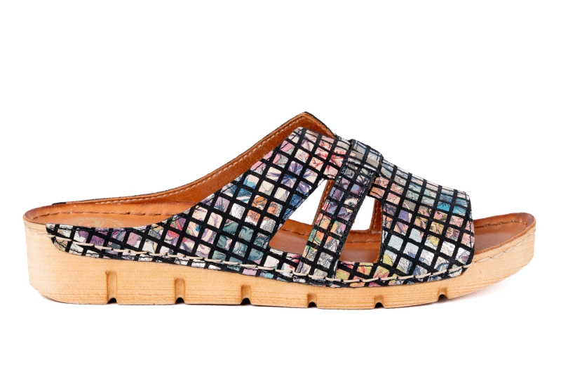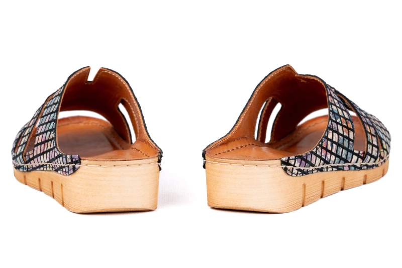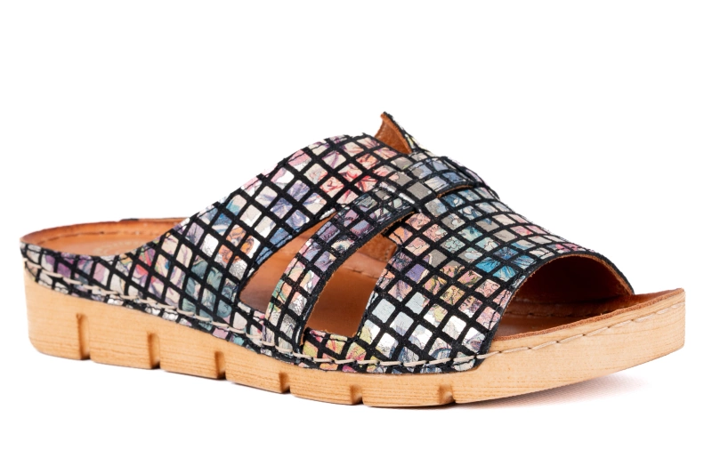 Klapki cechują się wyjątkową lekkością oraz miękką, skórzaną wkładką wewnętrzną, która dodatkowo zwiększa komfort użytkowania. Stabilna, grubsza podeszwa na niewysokim koturnie skutecznie amortyzuje i nie obciąża stóp.