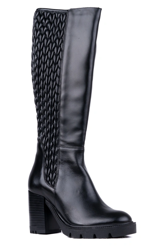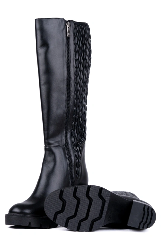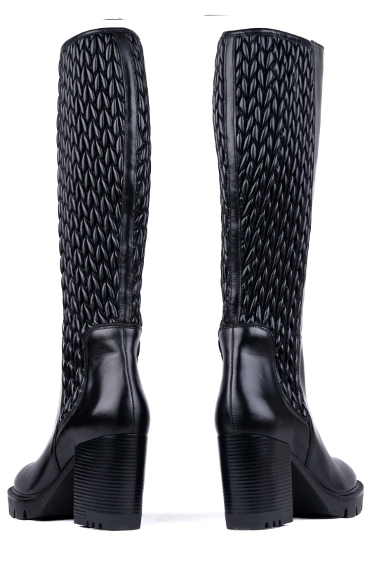 Tył cholewki został wykonany z prążkowanej, elastycznej gumy, co pozwala butom perfekcyjnie dopasować się do kształtu łydki. Materiał ten zapewnia pełną swobodę ruchów, minimalizuje ucisk i sprawia, że kozaki są wygodne nawet dla Pań o szerszych łydkach. Dodatkowo wstawka nadaje modelowi nowoczesny, elegancki charakter, łącząc funkcjonalność z atrakcyjnym wyglądem.