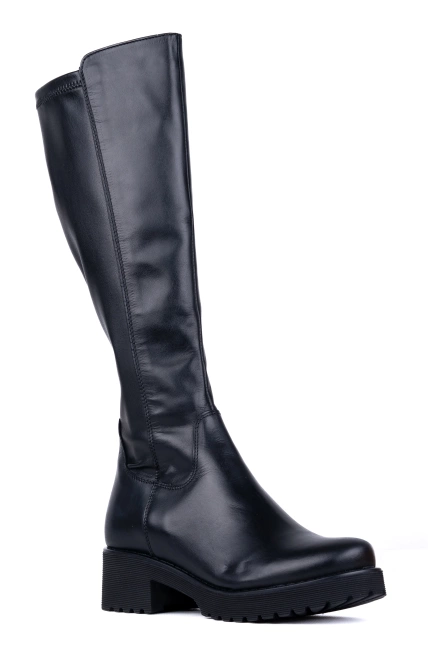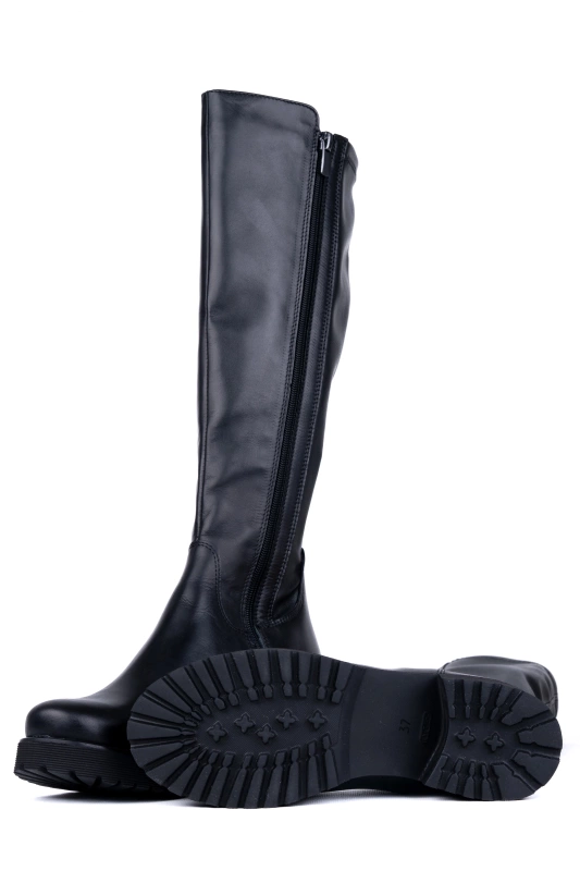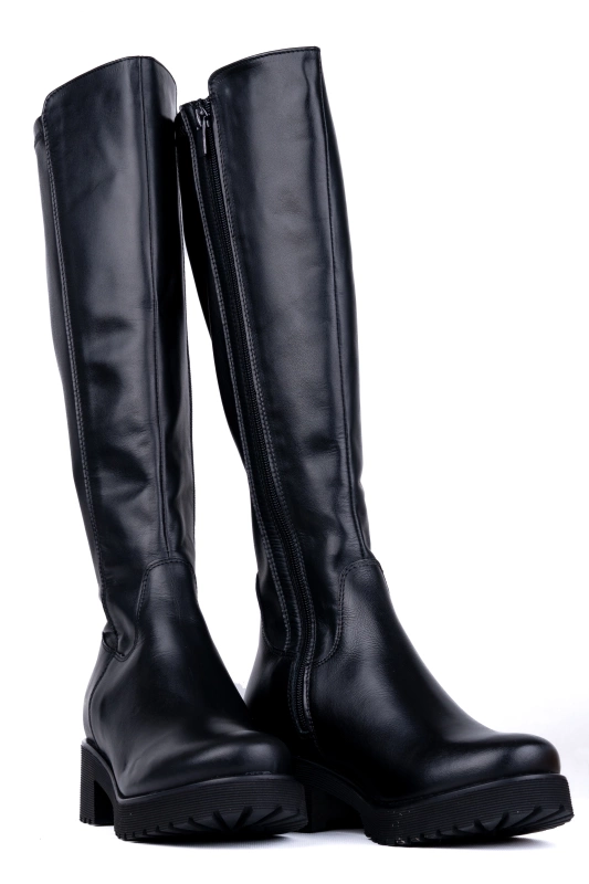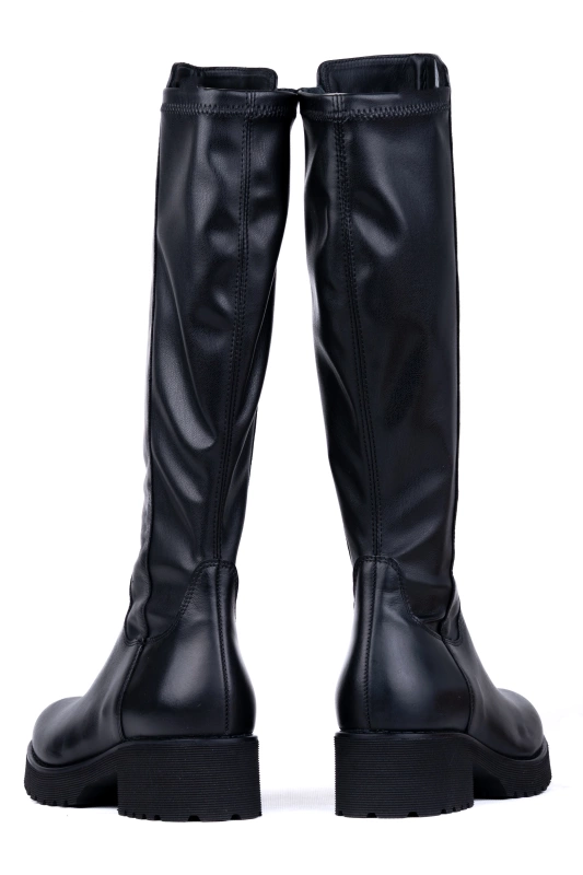Model posiada prostą, wysoką cholewkę sięgającą do kolan, a tył wykonany został z elastycznego materiału typu strecz, który do złudzenia przypomina skórę naturalną. Dzięki temu cholewka rozciąga się i dopasowuje do obwodu łydki, zapewniając idealne dopasowanie i wygodę.