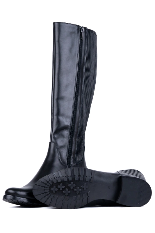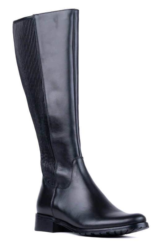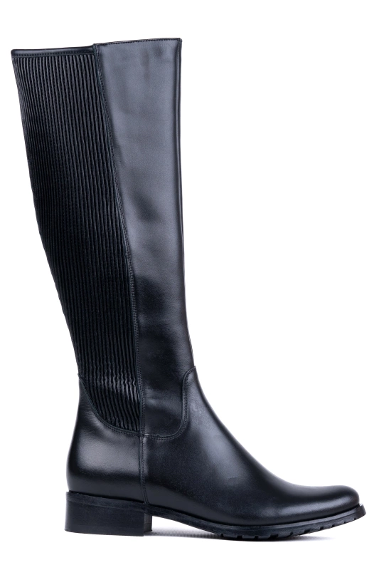 Model posiada prostą, wysoką cholewkę sięgającą do kolan, a tył wykonany został z elastycznej wstawki z gumy. Dzięki temu cholewka rozciąga się i dopasowuje do obwodu łydki, zapewniając idealne dopasowanie nawet przy pełniejszych nogach.