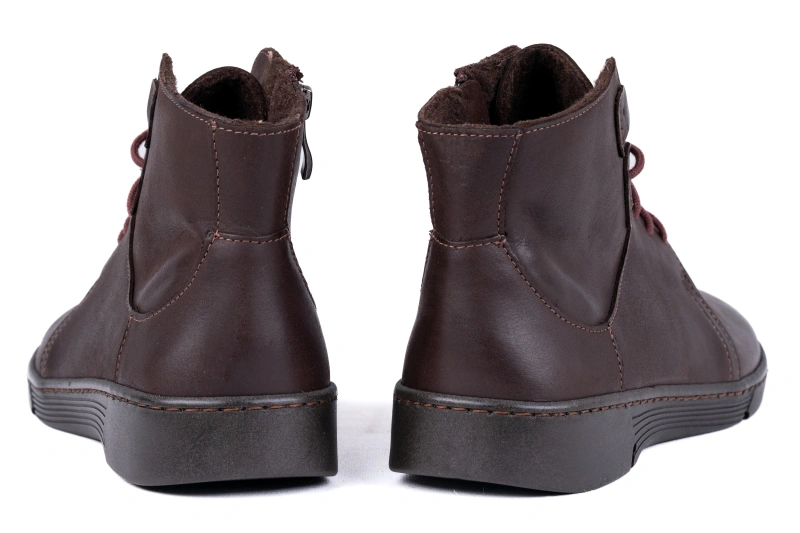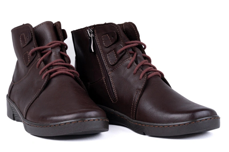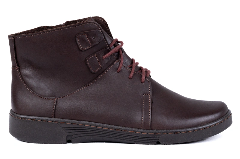 Bardzo wygodne trzewiki jesienno-zimowe w kolorze brązowym, buty ocieplone są materiałem typu polar. Prezentowany model, wykonany jest z najwyższej jakości bardzo miękkiej naturalnej skóry licowej. Skóra naturalna jest materiałem w pełni bezpiecznym i antyalergicznym, pozbawionym toksycznych chemikaliów.