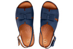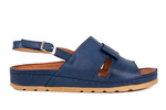 Okrągły, szeroki przód sandałów gwarantuje wygodę nawet dla szerszych stóp. Tęgość H sprawia, że model jest idealny dla kobiet z wyższym podbiciem i pełniejszą stopą. Cholewka z miękkiej, gniecionej skóry naturalnej w głębokim, granatowym kolorze nadaje butom elegancki wygląd i uniwersalny charakter.