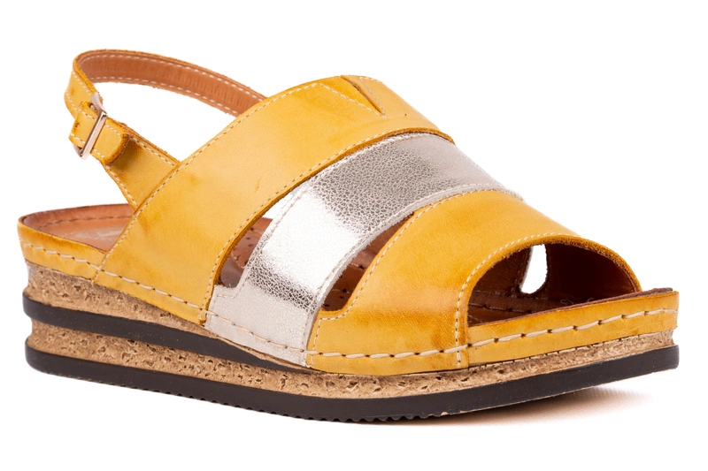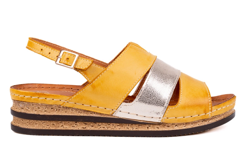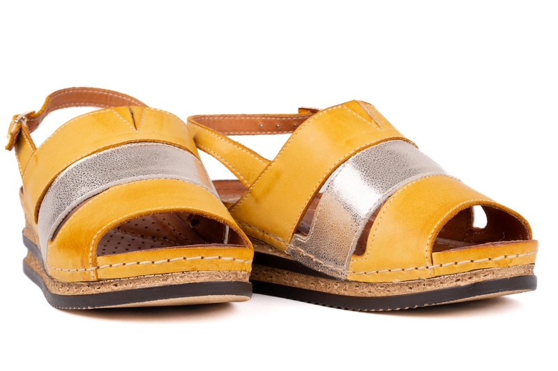 Cholewkę tworzą trzy szerokie paski, które stabilnie trzymają stopę. Środkowy pasek w delikatnym odcieniu złota dodaje całości elegancji i letniego blasku. Połączenie kolorów nadaje butom wyjątkowego, słonecznego wyglądu.