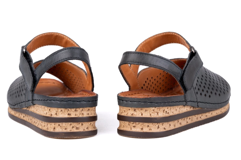 Buty osadzone są na lekkiej podeszwie imitującej korek, która prezentuje się naturalnie i stylowo. Szeroka, stabilna i grubsza podeszwa świetnie amortyzuje kroki i zapobiega zmęczeniu stóp – niezastąpiona w pracy, na spacerze czy podczas wakacyjnych aktywności.