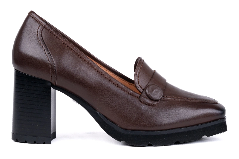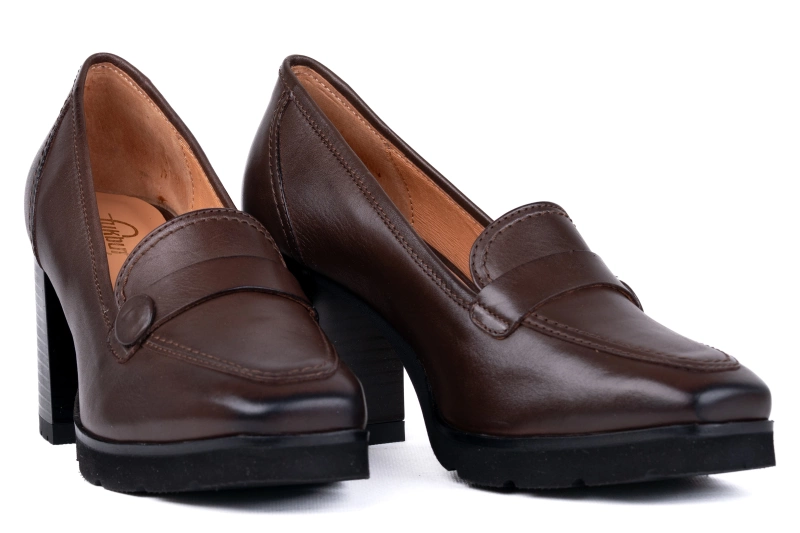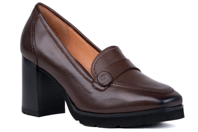 Eleganckie czółenka damskie w stylu mokasyna w pięknym czekoladowym kolorze to propozycja dla kobiet, które cenią komfort, wygodę i dobrą jakość. Model na wyższym słupku łączy klasyczny charakter mokasynów z nowoczesnym szykiem, podkreślając elegancję każdej stylizacji. Cholewka wykonana jest z miękkiej, naturalnej skóry, a ozdoba w postaci guzika powleczonego skórą dodaje subtelnego luksusu. Typowy dla mokasynów język oraz dopasowana linia cholewki sprawiają, że buty pięknie układają się na stopie, zapewniając komfort przez cały dzień. Te czółenka są idealnym wyborem na sezon wiosna i jesień, kiedy zarówno styl, jak i wygoda mają znaczenie.