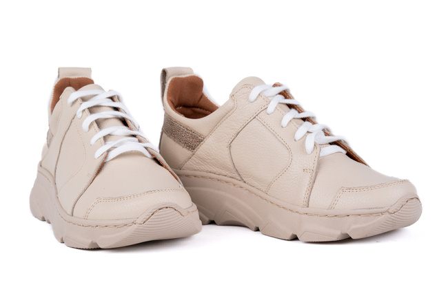 Model osadzony jest na beżowej, lekkiej i komfortowej podeszwie sportowej, idealnej do codziennego użytku. Miękkie, skórzane wnętrze zapewnia doskonałą cyrkulację powietrza i wyjątkowy komfort nawet przy długim noszeniu.
