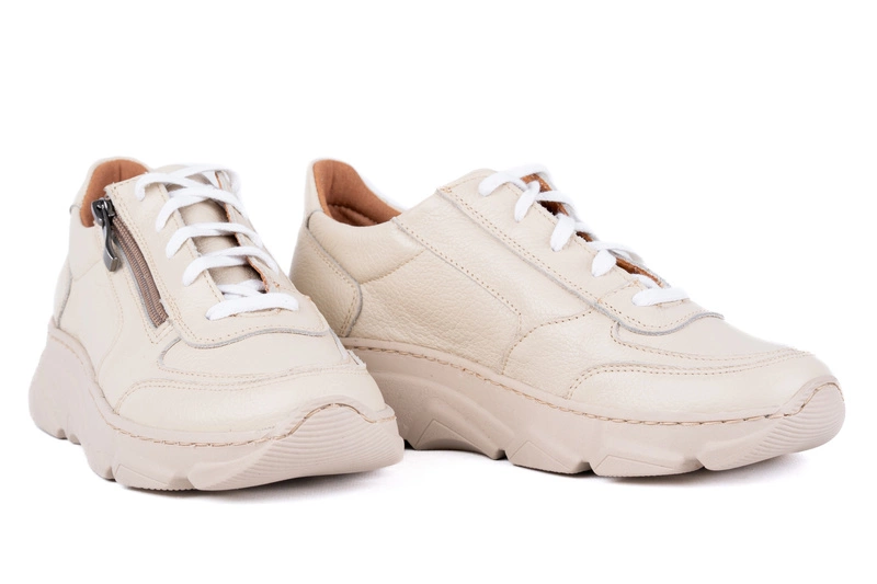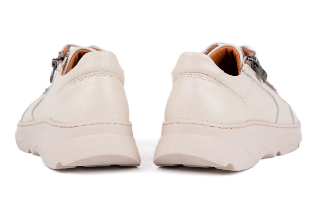 Model osadzony jest na beżowej, lekkiej i elastycznej podeszwie sportowej, która zapewnia doskonałą amortyzację i komfort noszenia. Wnętrze buta wyściełane zostało miękką skórą, dzięki czemu stopy mają zapewnioną odpowiednią cyrkulację powietrza i wygodę przez cały dzień.