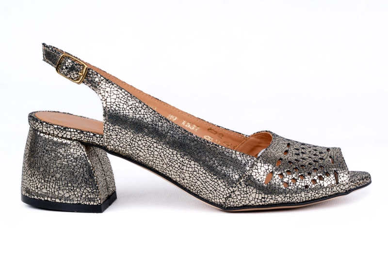 Model wykonany z naturalnej skóry w kolorze złotym z czarnym tłoczeniem świetnie sprawdzi się w letnich stylizacjach – zarówno codziennych, jak i bardziej eleganckich. Dzięki ażurowej cholewce, sandały zapewniają odpowiednią wentylację stóp w cieplejsze dni, a odkryte palce i pięta dodają im lekkości i kobiecego charakteru.