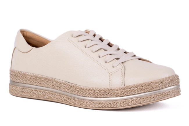 • Model wykonany z najwyższej jakości skóry naturalnej zachwyca nie tylko stylowym wyglądem, ale także miękkością i trwałością materiału. Buty osadzone są na wyższej podeszwie imitującej słomę, co nadaje im letniego, nieco boho charakteru – idealnego na cieplejsze dni