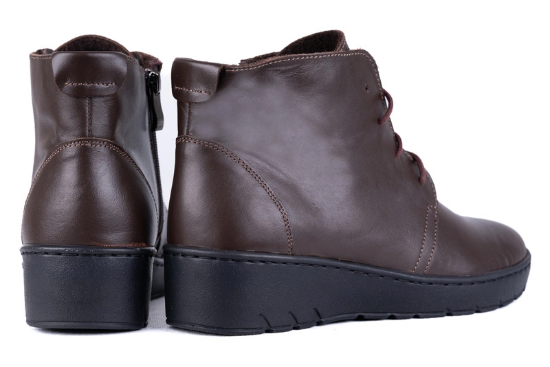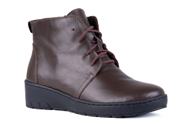 Bardzo wygodne trzewiki damskie w kolorze brązowym dla Pań ceniących klasykę i styl. Prezentowany model, wykonany jest z najwyższej jakości bardzo miękkiej naturalnej skóry licowej. Skóra naturalna jest materiałem w pełni bezpiecznym i antyalergicznym, pozbawionym toksycznych chemikaliów.
