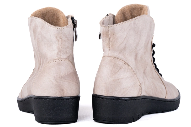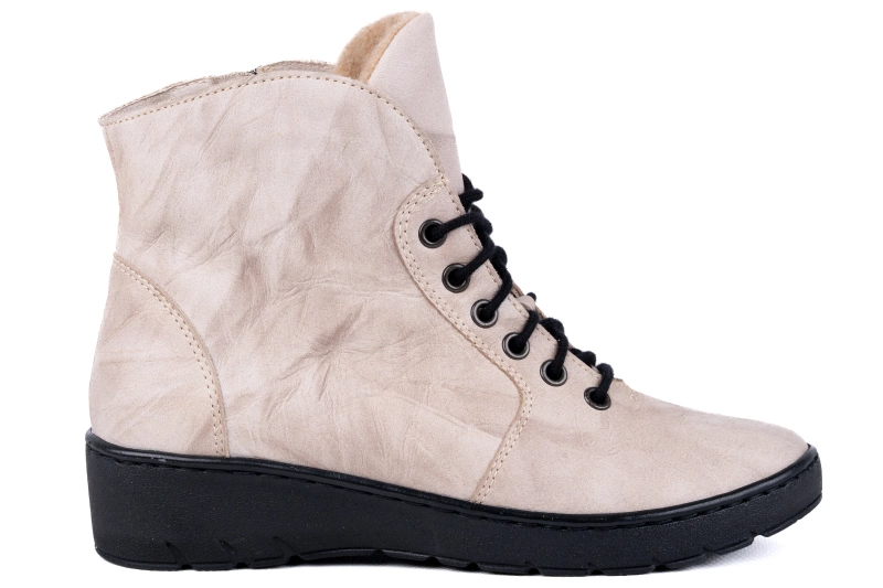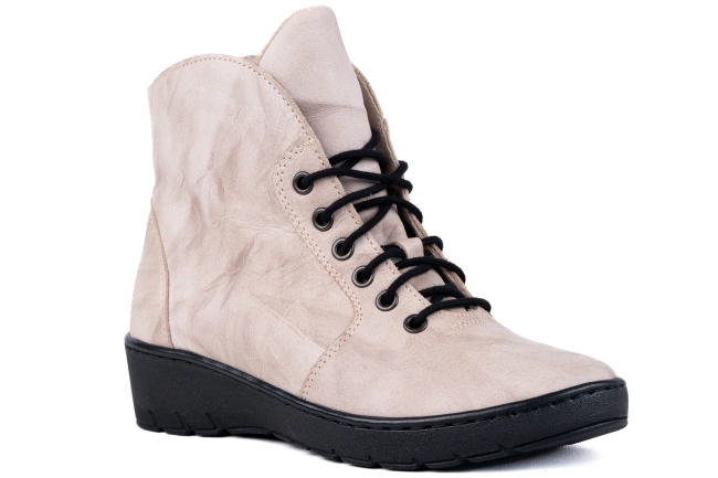 Trzewiki damskie wykonane z naturalnej skóry w kolorze przecieranego cappuccino to idealne połączenie elegancji i wygody. Skóra jest miękka i lekko gnieciona, dzięki czemu buty prezentują się naturalnie i z charakterem, a jednocześnie doskonale dopasowują się do stopy. Model osadzony jest na podeszwie typu klin o wysokości 4 cm, która zapewnia stabilność i wygodę podczas codziennego użytkowania. Tęgość G 1/2 gwarantuje komfort również dla nieco szerszej stopy.