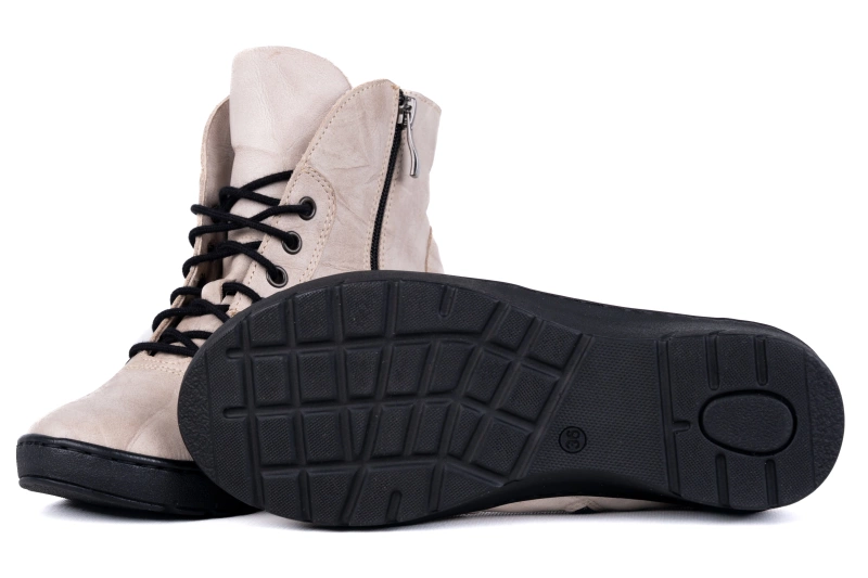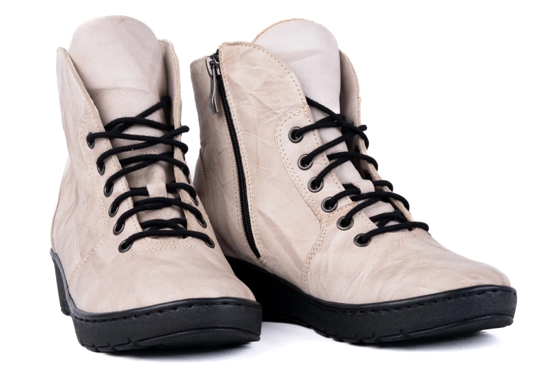 Z przodu trzewiki mają sznurowanie na metalowych oczkach, które kończy się w połowie wysokości cholewki, co pozwala idealnie dopasować but do tęgości stopy. Sznurowadła, podobnie jak podeszwa, są w kolorze czarnym, co tworzy elegancki kontrast z przecieraną skórą cappuccino. Nad sznurowaniem znajduje się delikatnie zaokrąglony język, dodający obuwiu modnego wyglądu. Z boku wszyty jest praktyczny suwak, który umożliwia szybkie zakładanie i zdejmowanie butów.