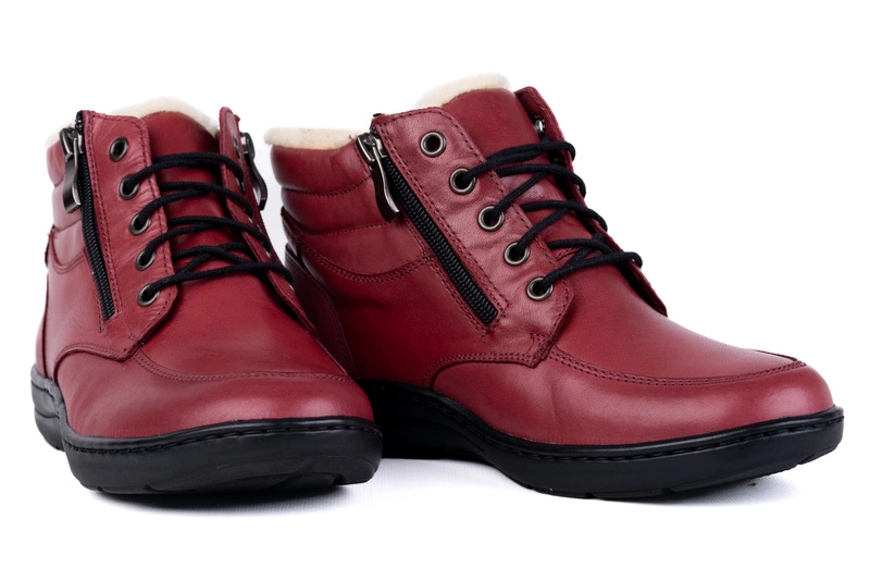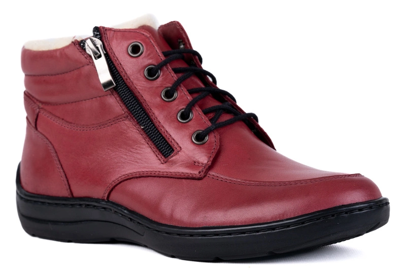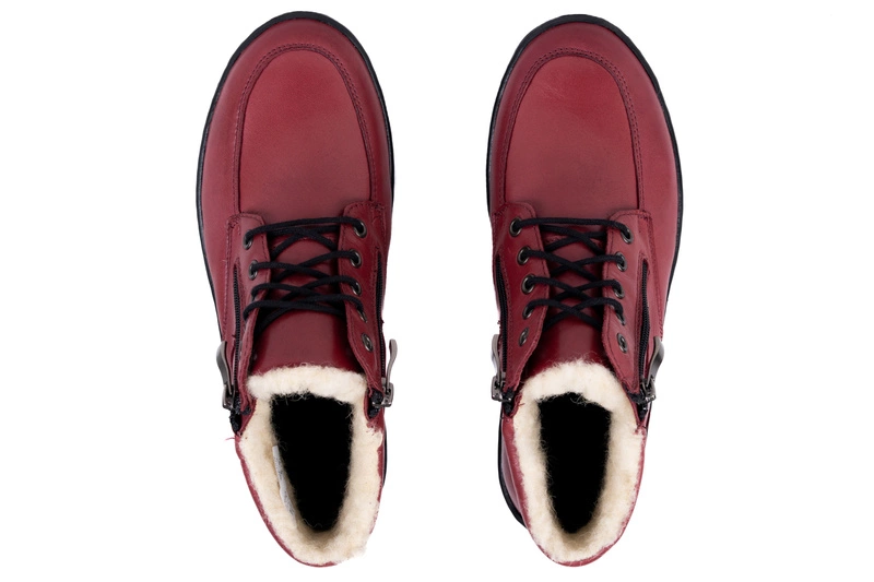 Bordowe trzewiki zimowe damskie ŁUKBUT – całe skórzane i ocieplane owczą wełną