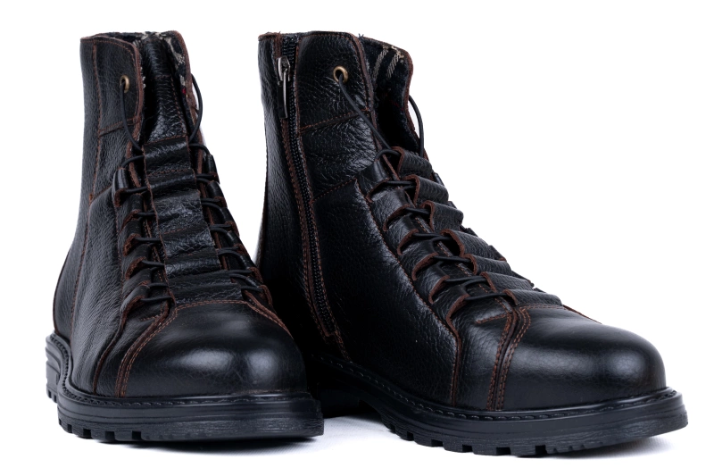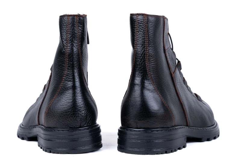 Trzewiki posiadają dwufunkcyjny system zapięcia – z boku wygodny suwak, który pozwala szybko założyć i zdjąć buty, oraz sznurowanie z przodu, wykonane z elastycznej gumki. Dzięki temu obuwie idealnie dopasowuje się do stopy, a jednocześnie nie wymaga codziennego wiązania. To praktyczne rozwiązanie, które doceni każdy mężczyzna ceniący wygodę.