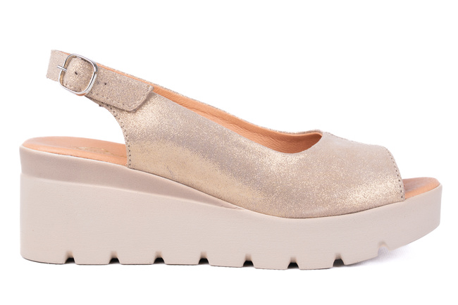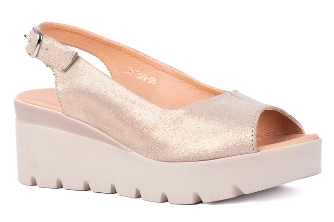 Skórzane sandały damskie na platformie – złote z odkrytą piętą i palcami | Polski producent Łukbut