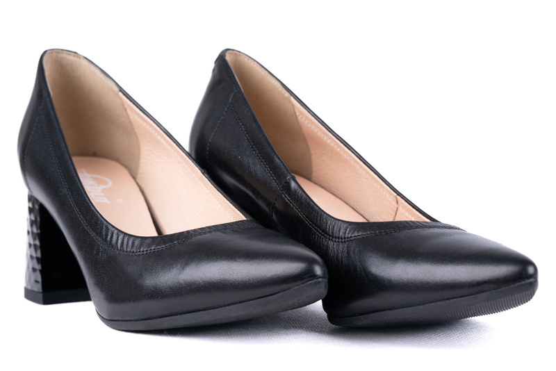 Opinie o Czarne gładkie czółenka ze zdobionym obcasem 5945